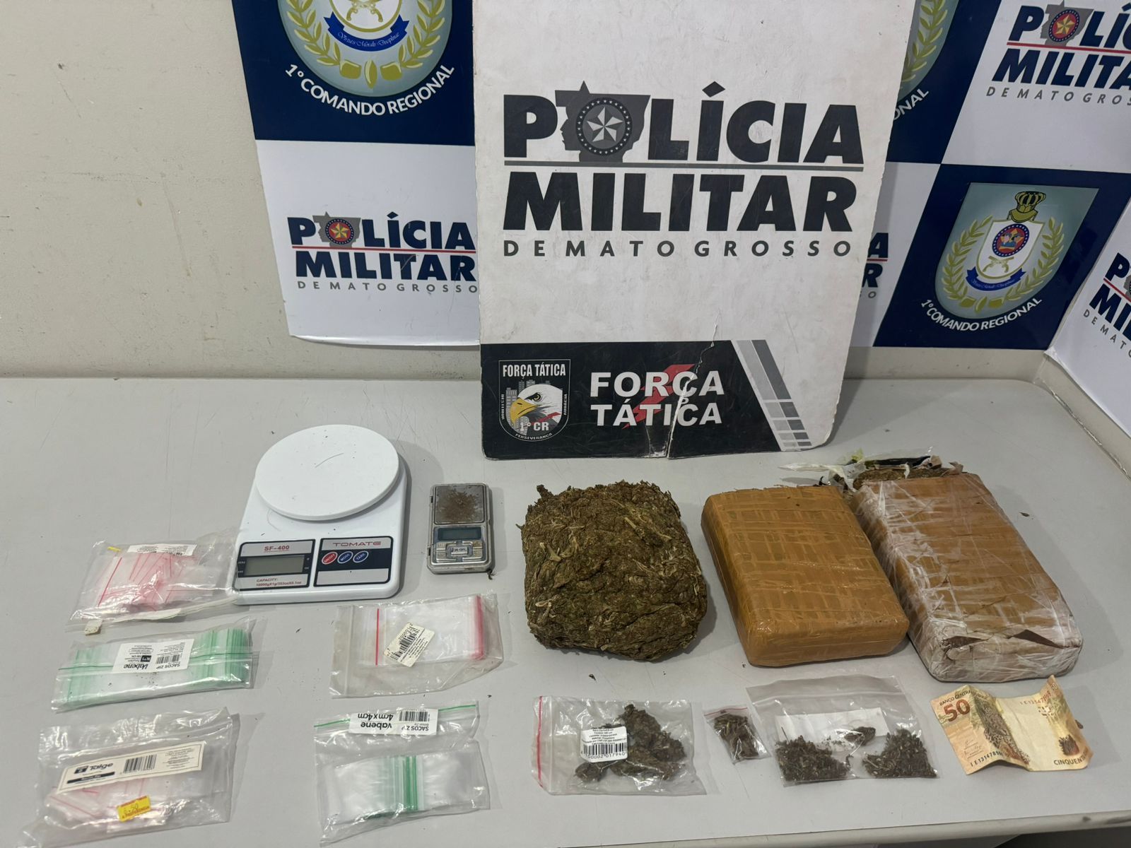 Na casa do segundo suspeito, a mãe dele informou que ele não estava presente. Contudo, os policiais encontraram três tabletes de maconha na geladeira, além de outras porções da droga, embalagens para venda e duas balanças de precisão.