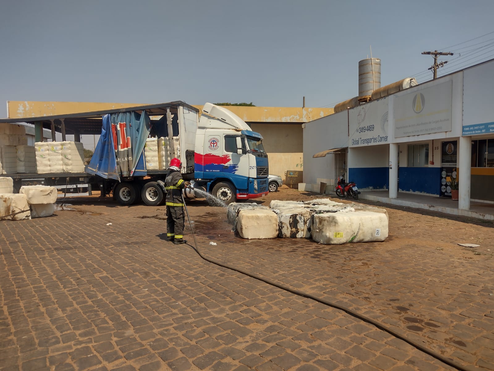 A equipe da 11ª Companhia Independente Bombeiro Militar (11ª CIBM) foi acionada, via 193, pelo condutor do veículo. No local, os bombeiros militares identificaram que populares iniciaram o primeiro combate ao fogo e utilizaram equipamentos preventivos de uma borracharia do posto. No entanto, apesar dos esforços iniciais, alguns fardos de algodão ainda estavam em chamas.