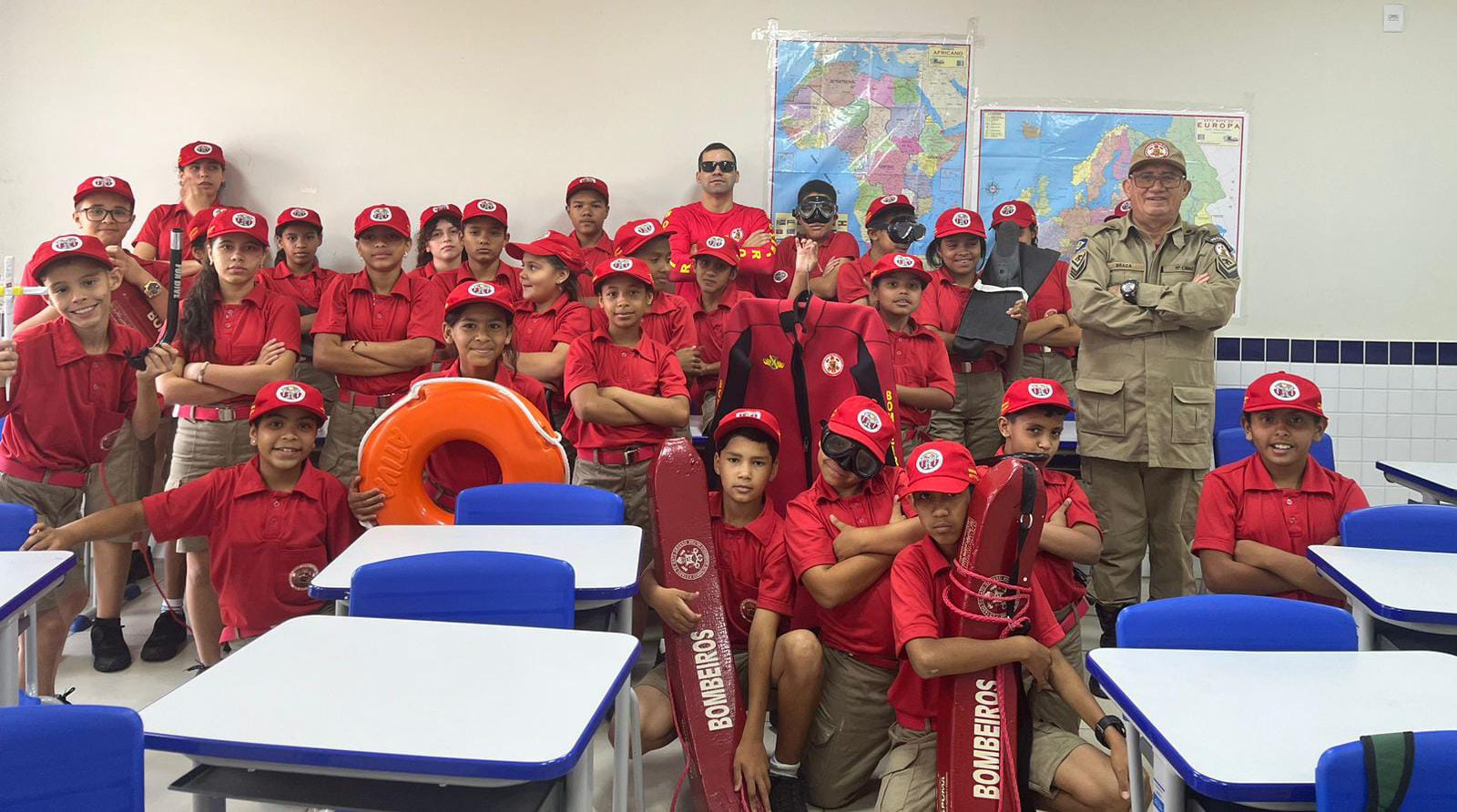 Os alunos aprenderam sobre os riscos associados aos afogamentos e foram apresentados a materiais de salvamento aquático e mergulho autônomo.
