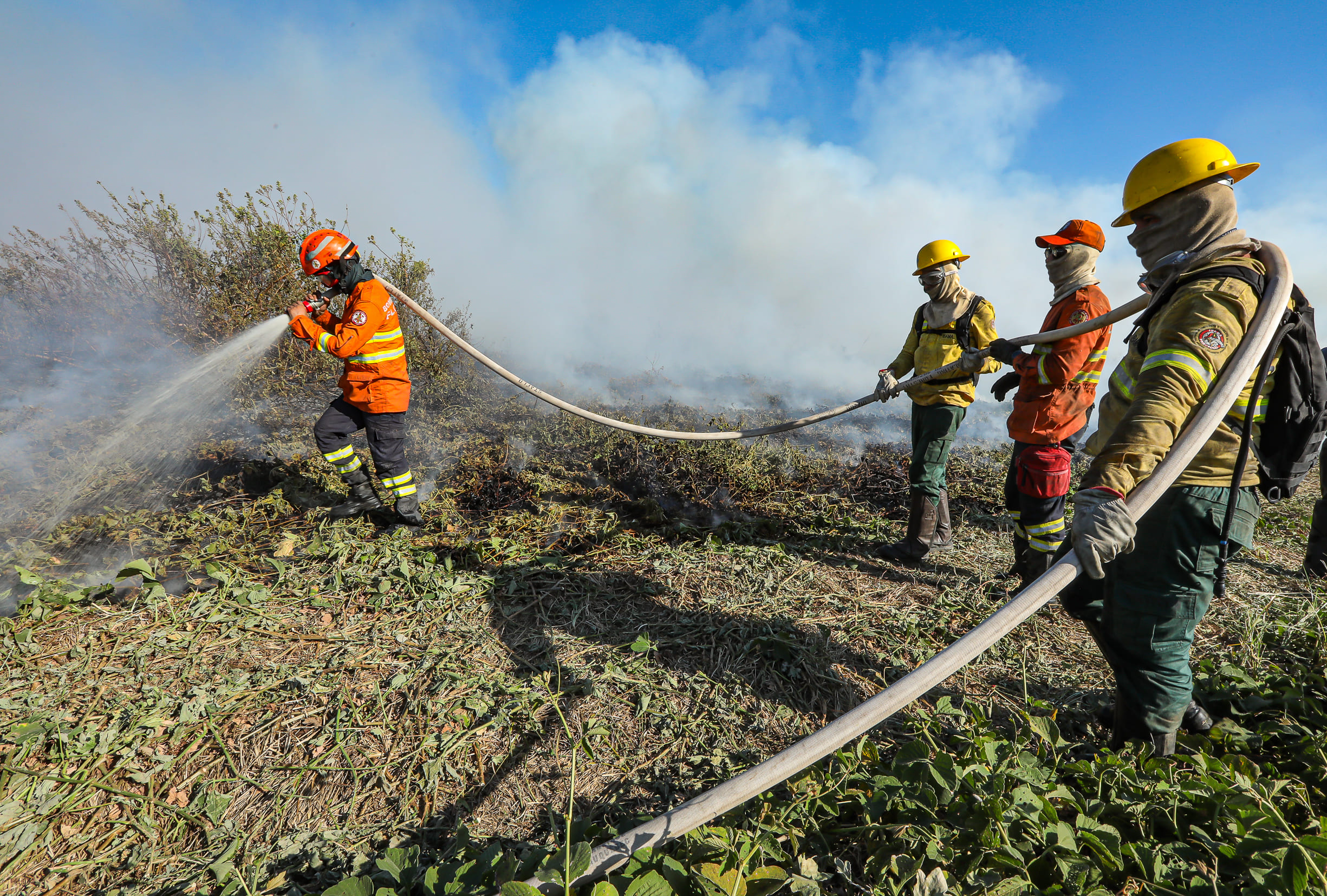 Em Chapada dos Guimarães, equipes combatem um incêndio na região do Portão do Inferno em locais onde há acesso, como próximo da rodovia MT-251 e na parte de cima dos paredões. Um avião dos Bombeiros é usado para o reconhecimento de área e planejamento de estratégias.