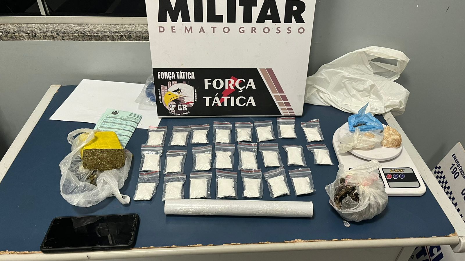O traficante ainda disse que teria mais drogas guardadas em sua casa e levou os militares ao endereço. No local, a Força Tática apreendeu mais porções de cocaína, meio tablete de maconha, balança de precisão e demais materiais utilizados no crime.