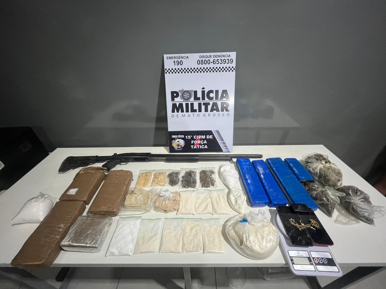 A Força Tática entrou na residência e encontrou duas adolescentes, que se apresentaram como namoradas dos suspeitos. Ainda pela casa, foram localizados os oito tabletes de maconha, porções de cocaína e pasta base e uma espingarda de calibre 12.