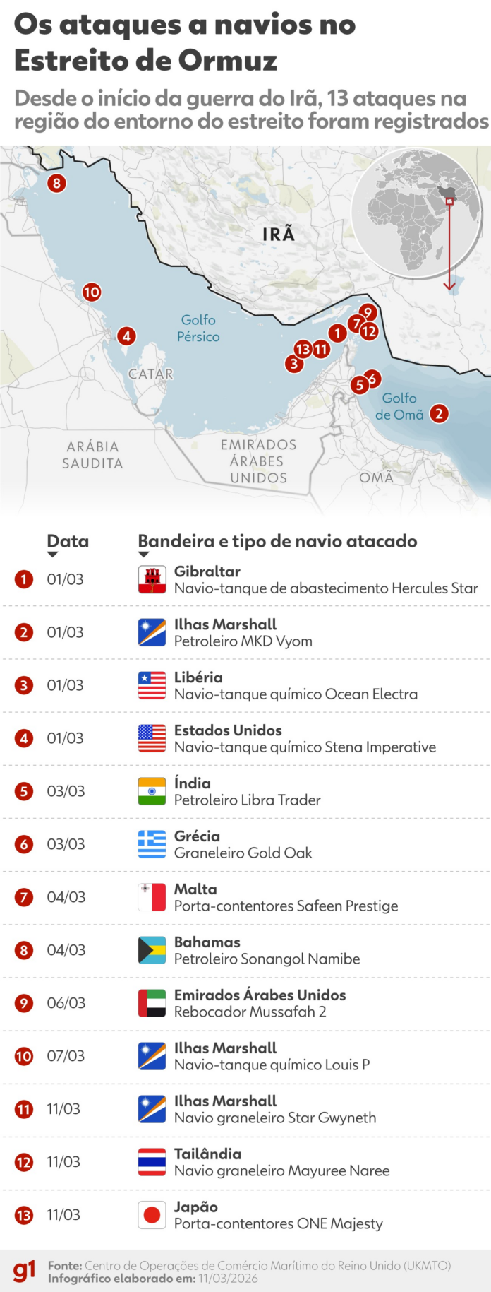 Nesta quarta (11) e quinta-feira (12) foram relatados diversos ataques iranianos contra navios comerciais ao redor do Estreito de Ormuz e do porto de Basra, no Iraque. O momento é de intensificação da pressão sobre a região do Golfo, rica em petróleo.