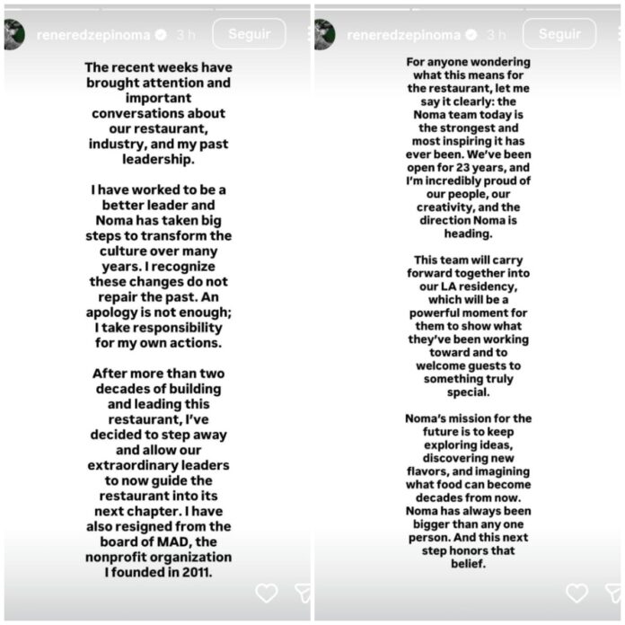 “Tenho trabalhado para ser um líder melhor e o Noma deu grandes passos para transformar sua cultura ao longo de muitos anos. Reconheço que essas mudanças não reparam o passado. Um pedido de desculpas não é suficiente; assumo a responsabilidade por minhas próprias ações”, diz a nota.