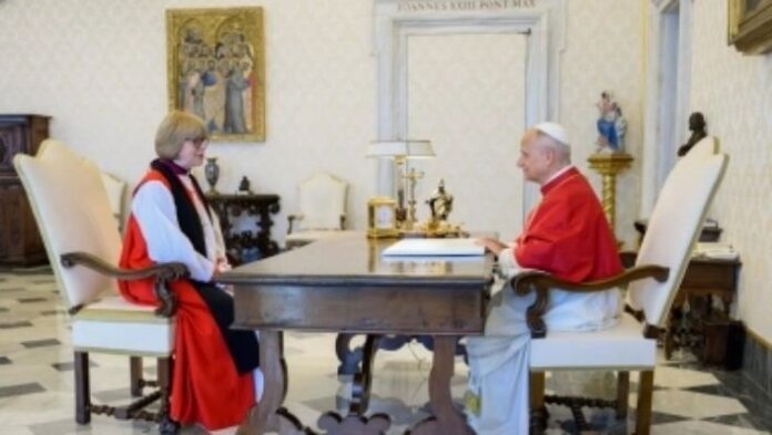 A arcebispa de Canterbury, Sarah Mullally, e o papa Leão XIV se reuniram no Vaticano em um encontro voltado ao fortalecimento das relações entre a Igreja Anglicana e a Igreja Católica. A reunião ocorreu no Palácio Apostólico e incluiu momentos de diálogo institucional, troca de presentes e uma oração conjunta.